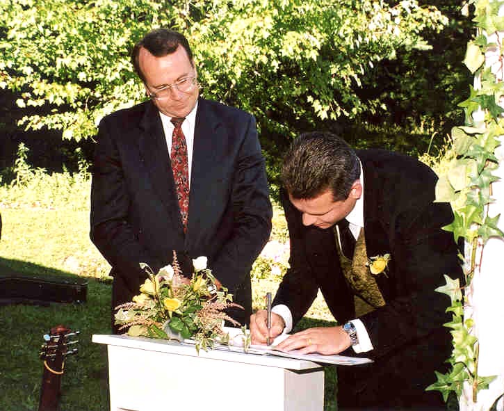 August 24th Update! Midnight report: A busy day and a busy night. Pretty much a normal day, only the activities were a little bit different. Dave Kalil came by and dropped off his piano and gear. He will be great as always. Peter Kingstone and his friend Derek, along with mom and dad Kingstone, helped Julie and Keenan with some of the final preparations. Keenan had a blast setting up the lighting, as he is always at his best when working with dozens of extension cords. Julie was busy working out a schedule for photographs, which proved to be fairly complicated. The place looks fantastic, and it is hard to believe that we will be walking down the aisle together in just a few hours! It's amazing just how right it feels to be doing this right now...had we had this ceremony a few years ago, it just wouldn't have been the same. We have shared so much together and with the people who will be there with us in the past couple of years...it really feels special. There has been no time to be nervous about anything. We won't be nervous until the ceremony actually starts, because we decided not to rehearse our vows. It says in the program that we are going to each have something to say...but we haven't even had time to think about it. It should be interesting!